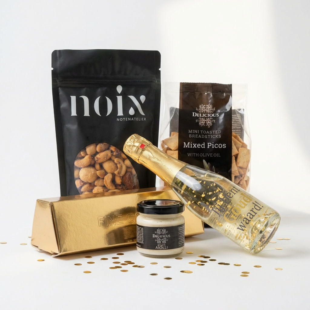 Op zoek naar een origineel “jij bent goud waard” cadeau dat nét even anders is? Met deze luxe borrelbox combineer je waardering met een gezellig moment. De mix van sprankelende bubbels en hartige snacks maakt dit cadeau perfect om samen van te genieten, op kantoor of thuis.
