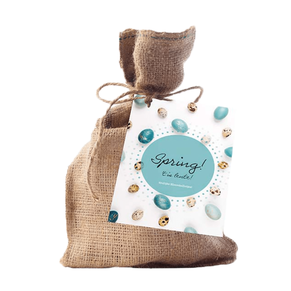 Vanaf 200 stuks is het jute zakje te personaliseren met een persoonlijke tekst, bijvoorbeeld een Paaswens, bedankje of korte boodschap namens jouw organisatie. Interesse in maatwerk? Vraag eenvoudig een offerte aan en ontvang snel een voorstel op maat.