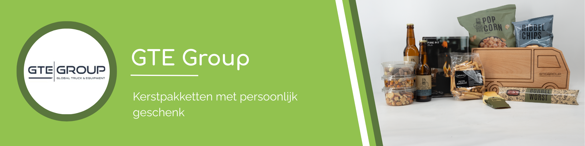 Centraal in het kerstpakket stond een unieke borrelplank in de vorm van een vrachtwagen. Een bewuste keuze die direct verwijst naar de kern van GTE Group en daarmee perfect aansluit bij de identiteit van het bedrijf. De plank is voorzien van een subtiel gegraveerd GTE Group-logo, wat zorgt voor herkenbare maar ingetogen branding.